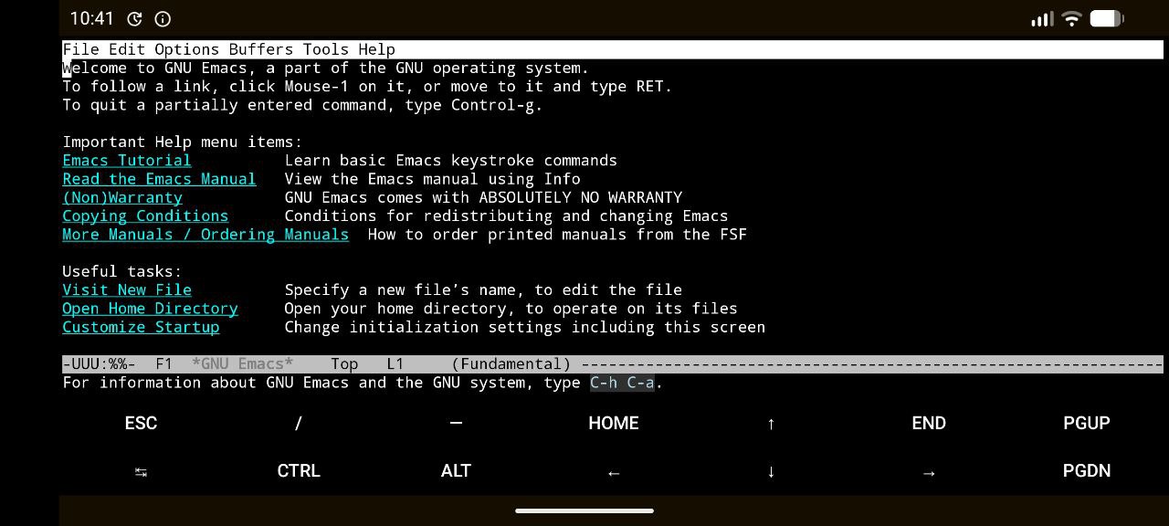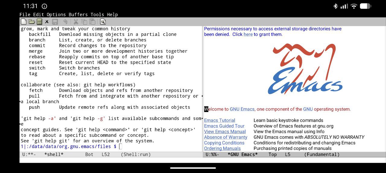 La primera es instalar Emacs nativo desde F-Droid o desde desde el FTP de GNU Emacs. Son equivalentes. Este Emacs es gráfico, permite mostrar imágenes por ejemplo pero no puede interactuar con el sistema ya que se encuentra aislado del resto de apps y del sistema.