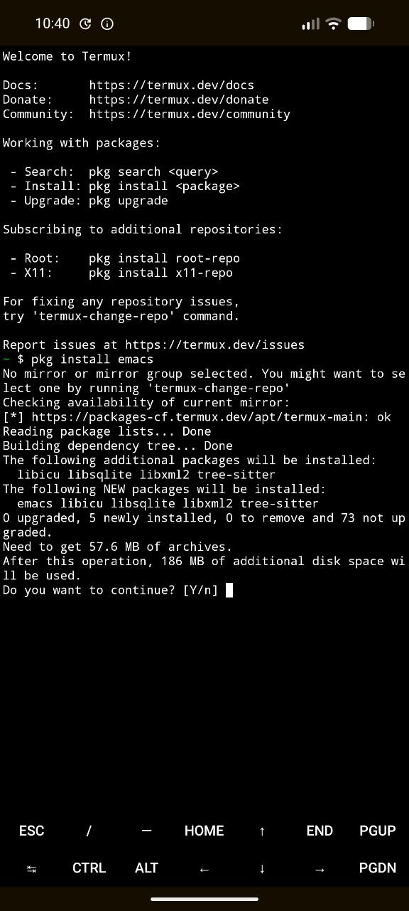 A continuación instalamos Emacs del FTP de GNU Emacs, por ejemplo este: https://ftp.gnu.org/gnu/emacs/android/termux/emacs-30.2-29-arm64-v8a.apk. Abrimos Termux y ejecutamos: pkg update && pkg upgrade. Esto nos servirá para actualizar los paquetes dentro de Termux. Una vez acabado podríamos ya instalar programas que querramos usar conjuntamente con Emacs como Git, GCC, SBCL, OpenJDK, SWI Prolog, etc