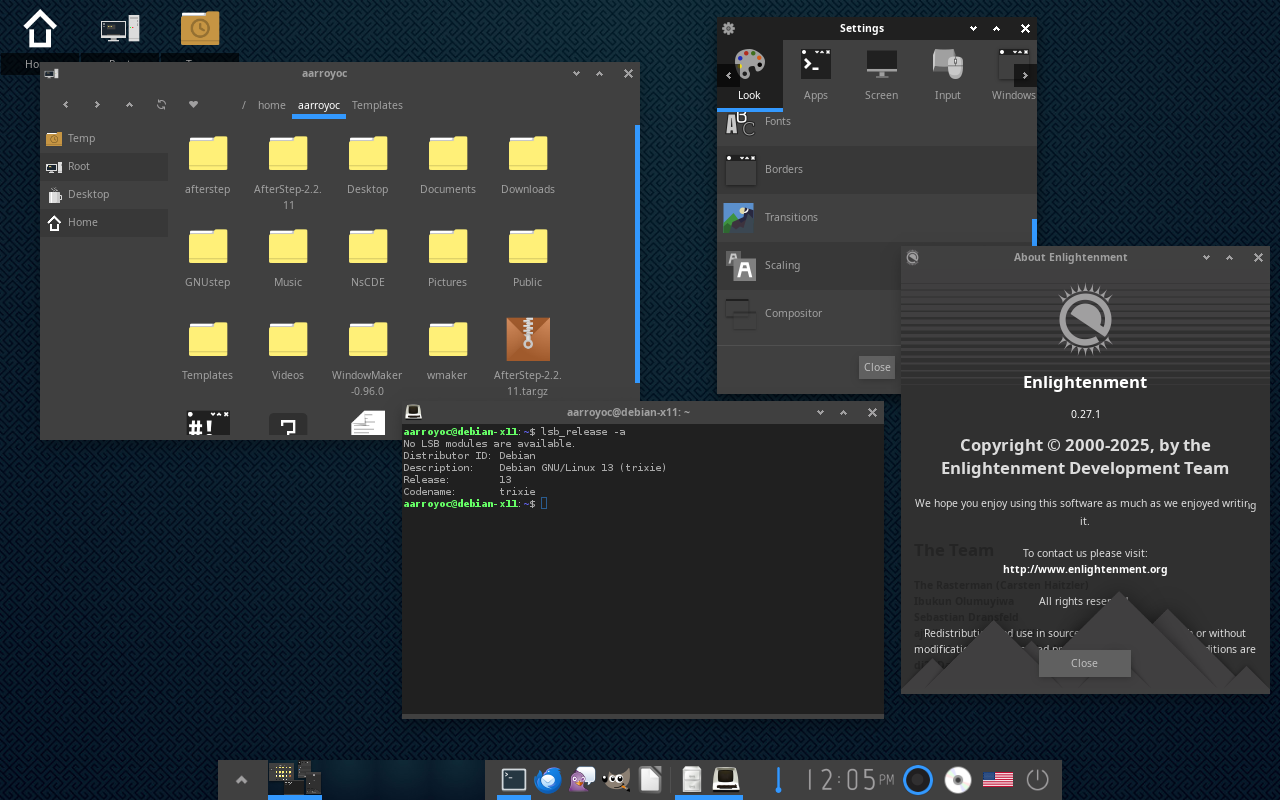 Enlightenment es uno de los escritorios más veteranos de Linux. Sin embargo nunca ha gozado de gran popularidad. Desarrolló sus propias librerías gráficas, EFL, las cuáles se han usado principalmente en sistemas embebidos debido a su menor consumo respecto a GTK y Qt.