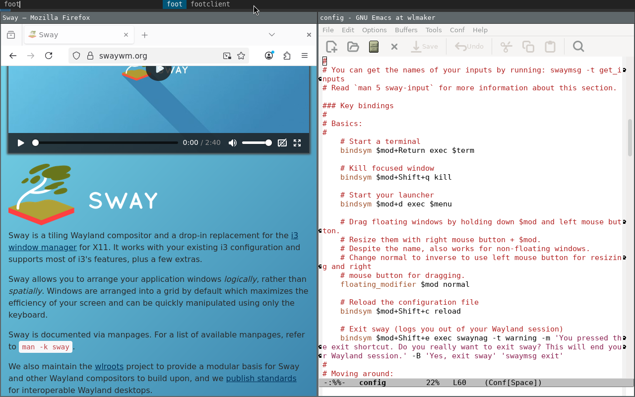Sway es una adaptación de i3, uno de los window manager más populares del mundo de las X a Wayland. Sway es junto con Hyprland y Niri uno de los window managers más populares del mundo Wayland. Se trata de un tiling window manager. Es decir, las ventanas no se superponen una encima de la otra sino que siempre se les asigna huecos. Estos window managers funcionan muy bien para ser controlados por teclado.